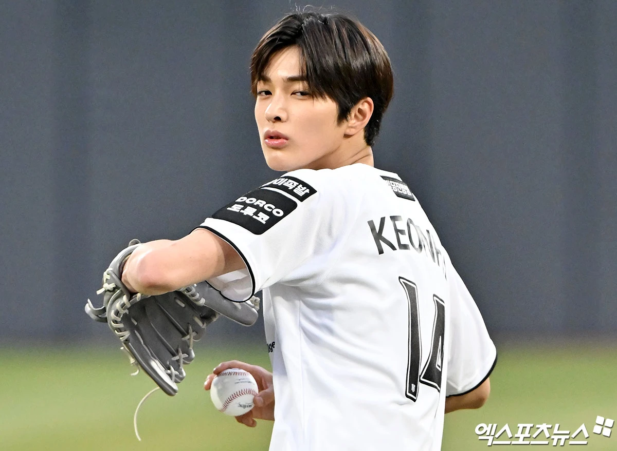 (엑스포츠뉴스 수원, 김한준 기자) 3일 오후 수원KT위즈파크에서 열린 '2026 신한 SOL Bank KBO리그' 삼성 라이온즈와 KT 위즈의 경기, 경기 전 그룹 코르티스 건호가 시구에 임하고 있다.