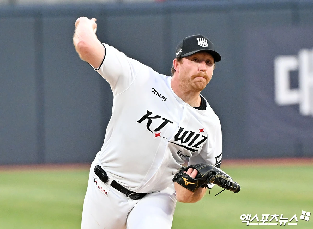 (엑스포츠뉴스 수원, 김한준 기자) 3일 오후 수원KT위즈파크에서 열린 '2026 신한 SOL Bank KBO리그' 삼성 라이온즈와 KT 위즈의 경기, 1회초 KT 선발투수 사우어가 공을 힘차게 던지고 있다.