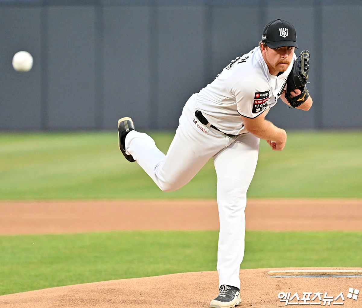 (엑스포츠뉴스 수원, 김한준 기자) 3일 오후 수원KT위즈파크에서 열린 '2026 신한 SOL Bank KBO리그' 삼성 라이온즈와 KT 위즈의 경기, 1회초 KT 선발투수 사우어가 공을 힘차게 던지고 있다.