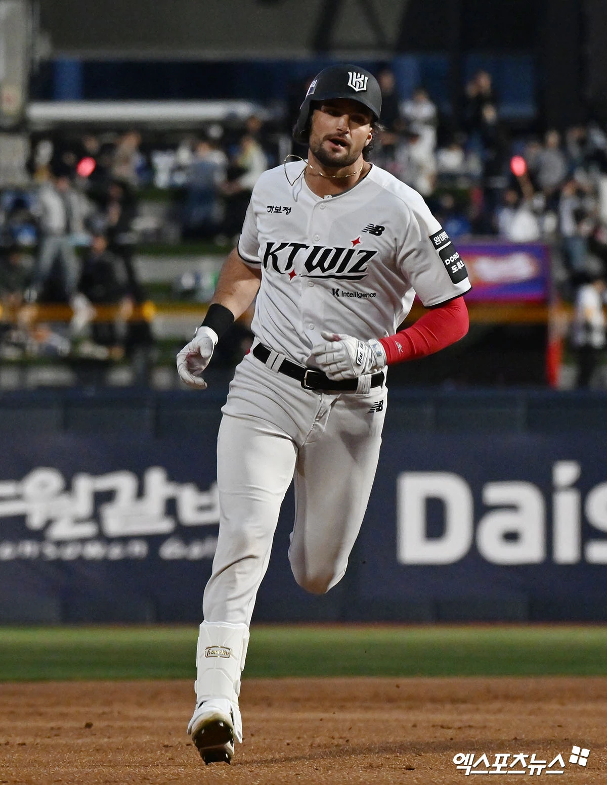 (엑스포츠뉴스 수원, 김한준 기자) 3일 오후 수원KT위즈파크에서 열린 '2026 신한 SOL Bank KBO리그' 삼성 라이온즈와 KT 위즈의 경기, 2회말 KT 힐리어드가 솔로 홈런을 날린 후 기뻐하고 있다.