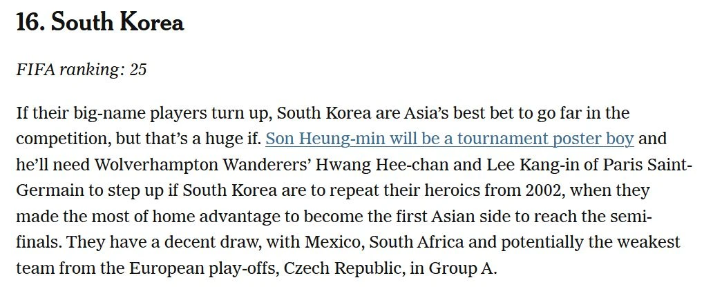 '디 애슬레틱'은 한국에 대해 "주요 선수들이 제 역할을 해준다면 아시아에서 가장 높이 올라갈 수 있는 팀"이라며 "손흥민, 이강인 등 스타 선수들의 컨디션이 중요하다"고 평가했다.