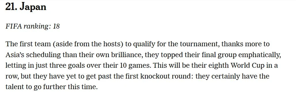 일본 매체 '디 앤서'는 3일(한국시간) "미국 매체에서 발표된 월드컵 전력 순위에 의문이 소용돌이치고 있다"며 일본이 21위에 그친 결과를 집중 조명했다.