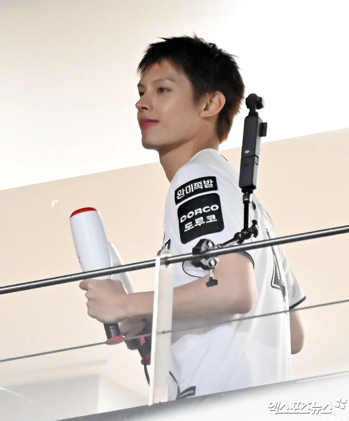 (엑스포츠뉴스 수원, 김한준 기자) 3일 오후 수원KT위즈파크에서 열린 '2026 신한 SOL Bank KBO리그' 삼성 라이온즈와 KT 위즈의 경기, 시타를 마친 그룹 코르티스 제임스가 열띤 응원을 선보이고 있다.