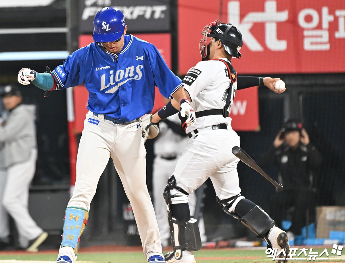 (엑스포츠뉴스 수원, 김한준 기자) 3일 오후 수원KT위즈파크에서 열린 '2026 신한 SOL Bank KBO리그' 삼성 라이온즈와 KT 위즈의 경기, 6회초 2사 3루 삼성 김영웅이 헛스윙 삼진을 당한 후 배트를 내던지고 있다.