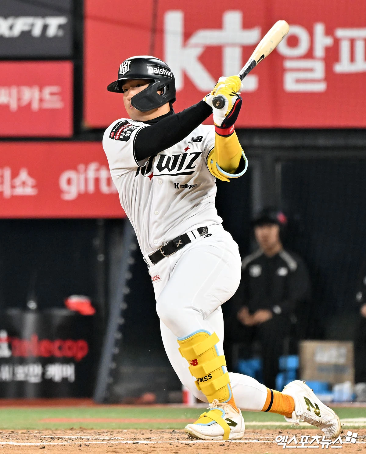 (엑스포츠뉴스 수원, 김한준 기자) 3일 오후 수원KT위즈파크에서 열린 '2026 신한 SOL Bank KBO리그' 삼성 라이온즈와 KT 위즈의 경기, 8회말 2사 KT 안현민이 좌전안타를 날리고 있다.