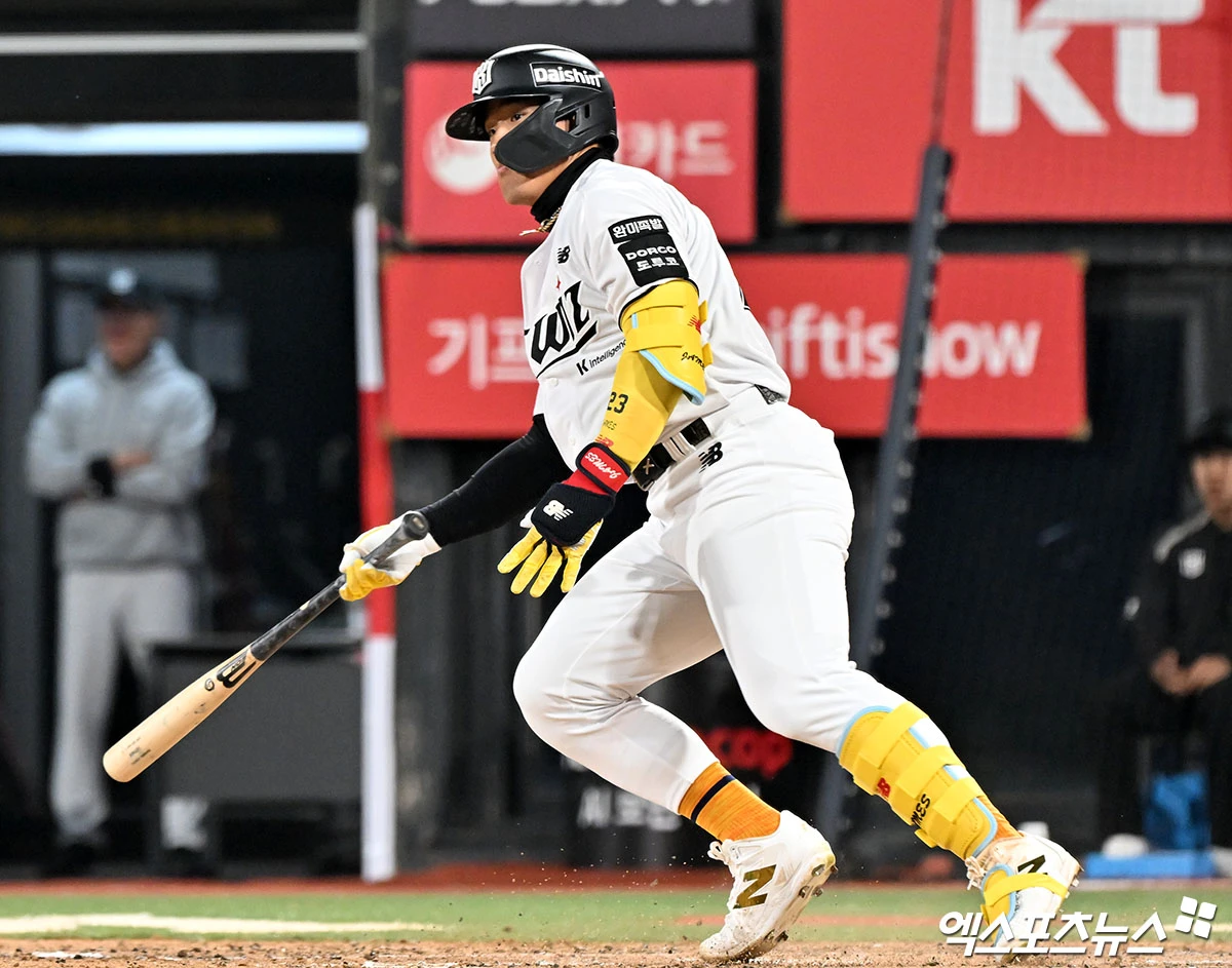 (엑스포츠뉴스 수원, 김한준 기자) 3일 오후 수원KT위즈파크에서 열린 '2026 신한 SOL Bank KBO리그' 삼성 라이온즈와 KT 위즈의 경기, 8회말 2사 KT 안현민이 좌전안타를 날리고 있다.