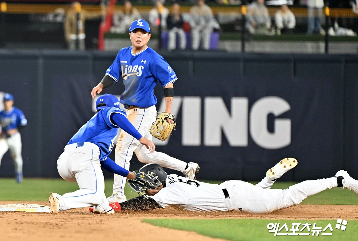 (엑스포츠뉴스 수원, 김한준 기자) 3일 오후 수원KT위즈파크에서 열린 '2026 신한 SOL Bank KBO리그' 삼성 라이온즈와 KT 위즈의 경기, 9회말 무사 1루 KT 장진혁이 2루 도루를 시도하고 있다.