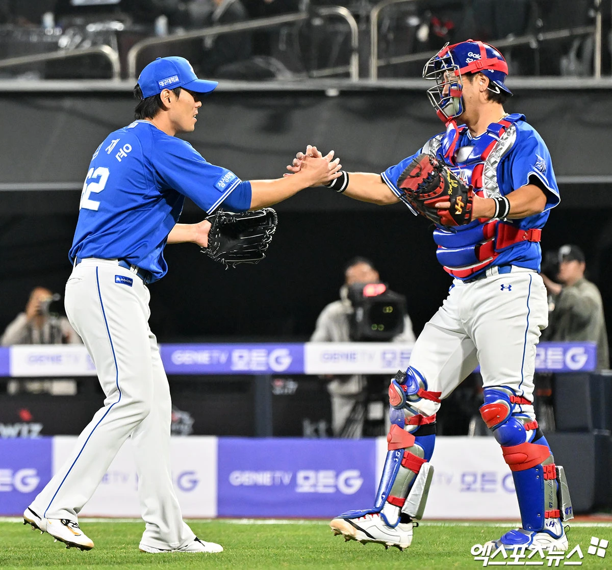 이날 경기에서 승리한 삼성 선수들이 기뻐하고 있다.