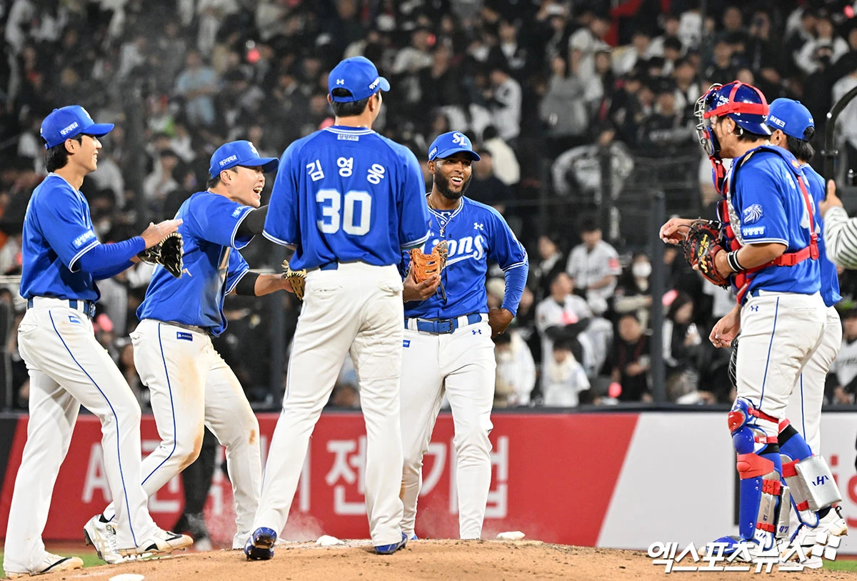 이날 경기에서 승리한 삼성 선수들이 기뻐하고 있다.