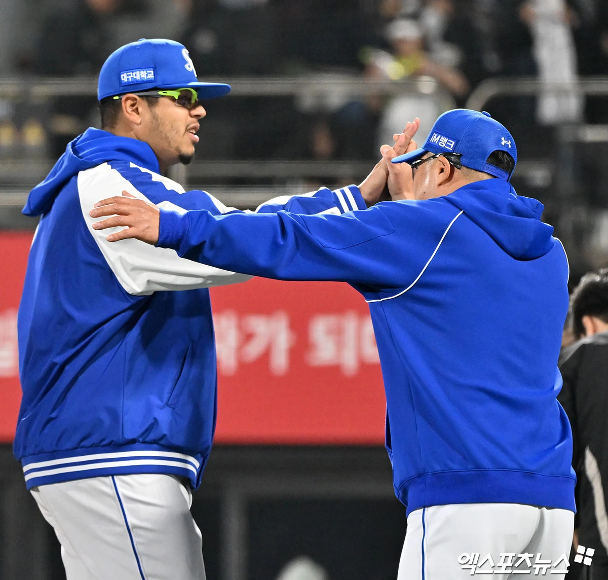 이날 경기에서 승리한 삼성 박진만 감독이 후라도와 함께 기뻐하고 있다.