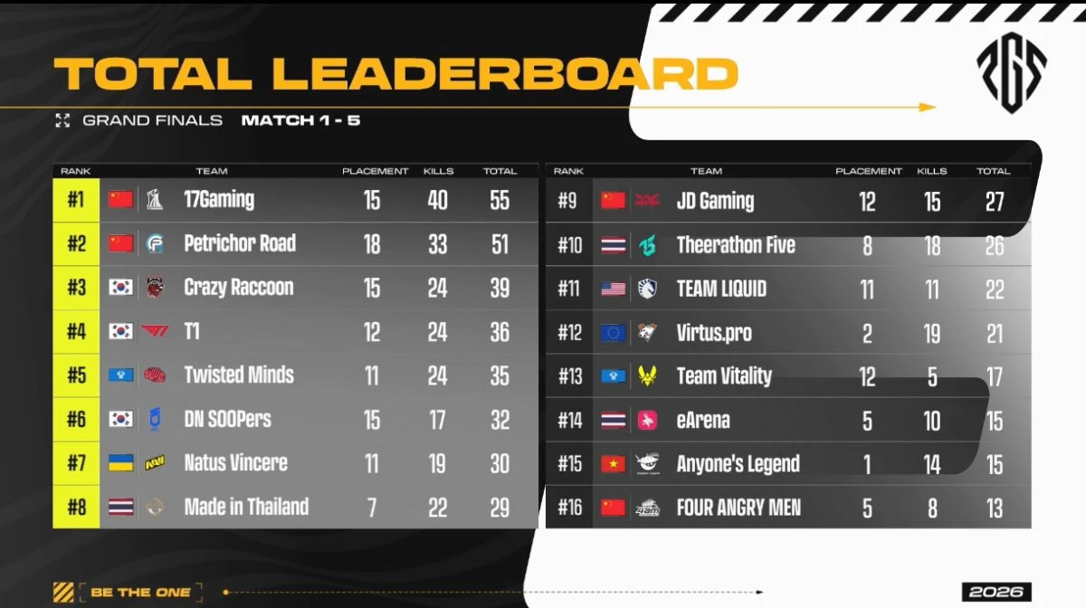 준비된 다섯 매치를 모두 치른 결과, 17게이밍이 총점 55점으로 1위에 올랐다. 그리고 뒤를 이어 51점의 페트리코 로드가 2위, 39점의 크레이지 라쿤이 3위에 올라 상위권을 형성했다.