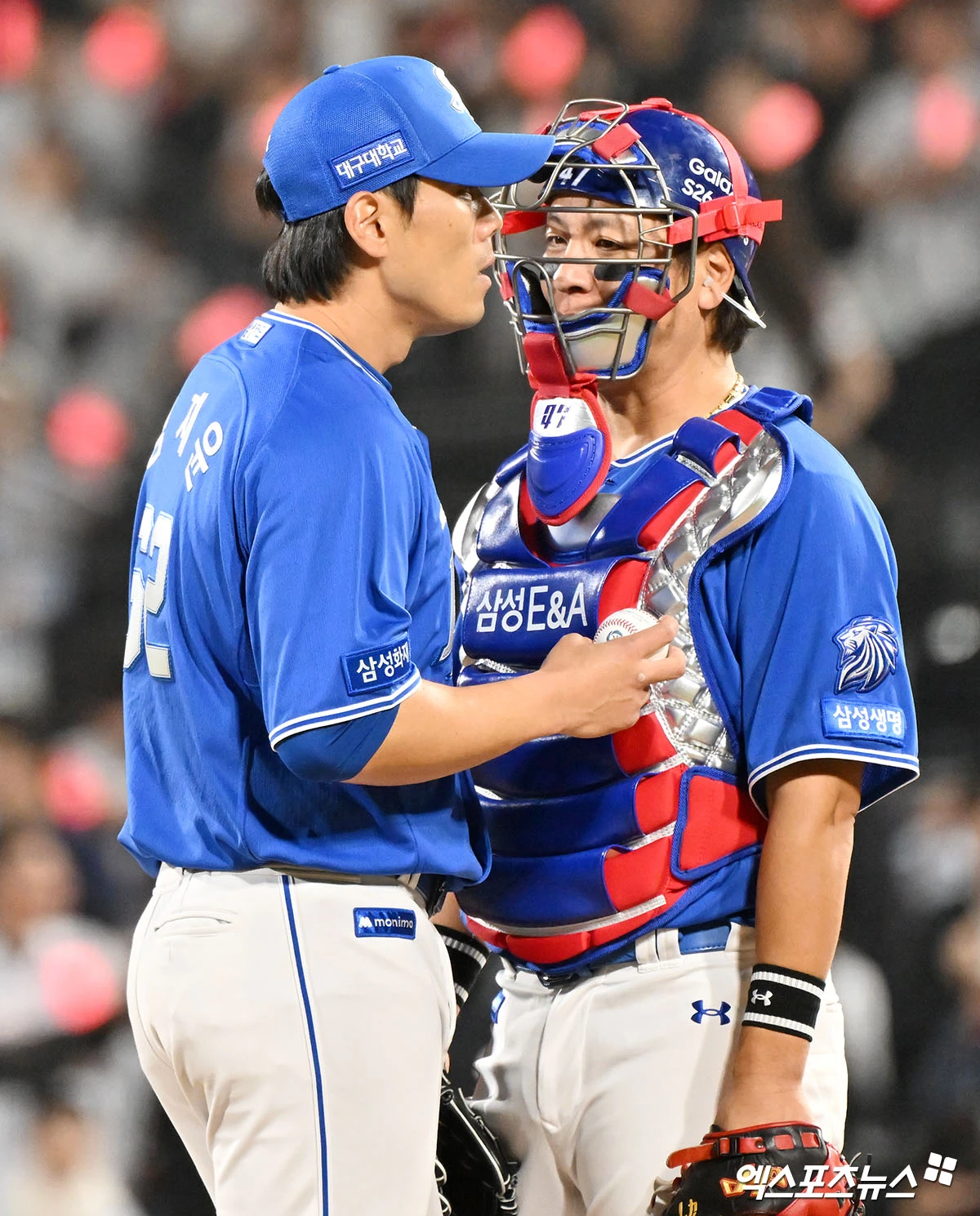 9회말 무사 1루 삼성 김재윤과 강민호가 대화를 나누고 있다.