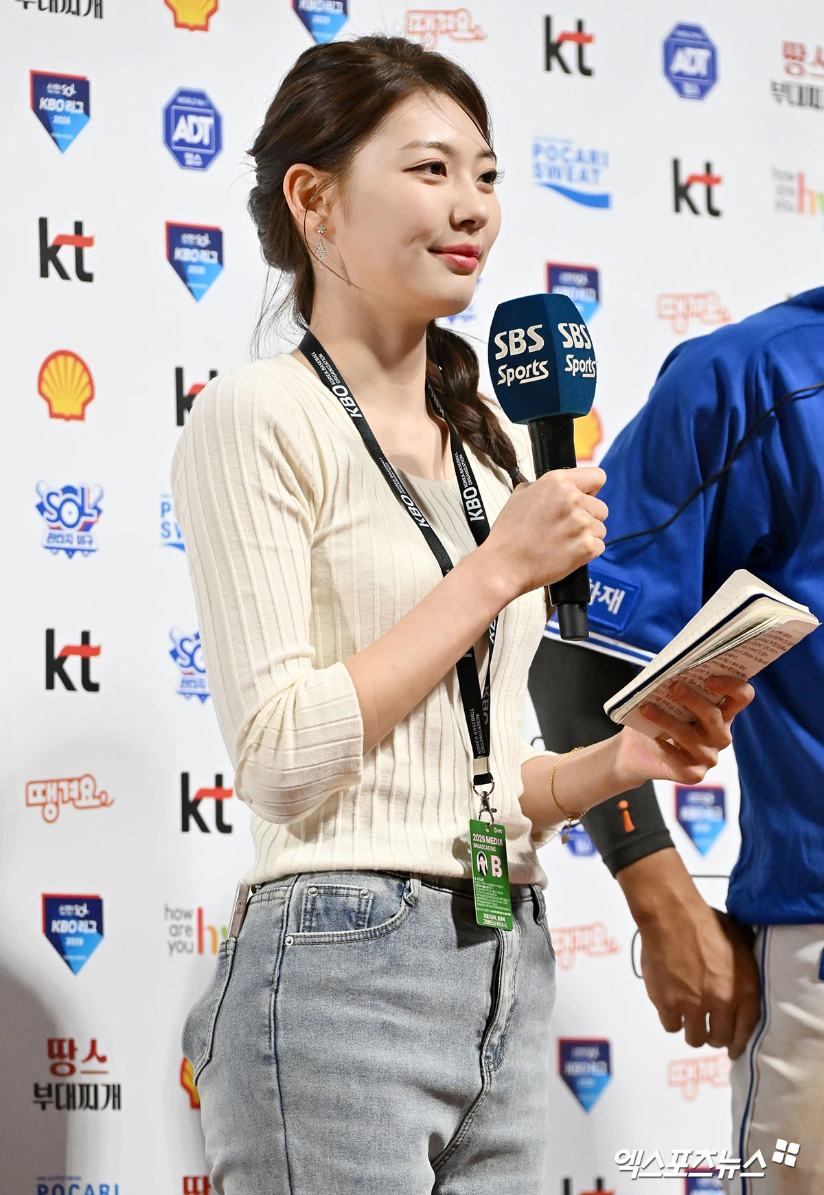 경기종료 후 박주은 아나운서가 수훈선수 인터뷰를 준비하고 있다.