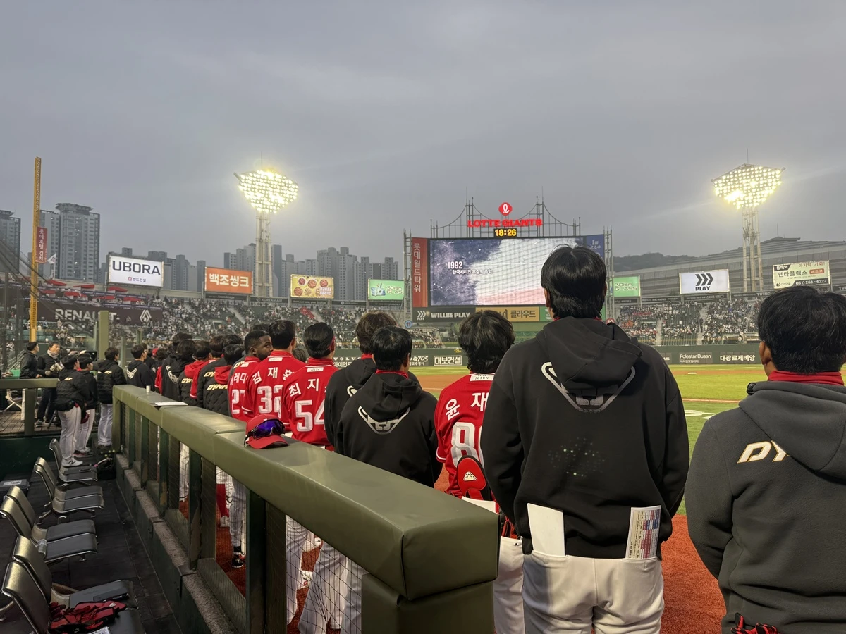 홈 첫 경기를 앞두고 롯데가 다양한 행사를 준비한 가운데, 애국가 제창을 마치고 전광판에 영상이 표출됐다. 바로 김민재 코치 추모영상이었다.