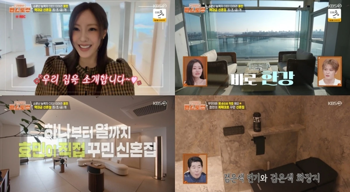 방송 최초로 공개된 효민의 신혼집은 흡사 카페 같은 한강뷰 테라스가 인상적이었다. 이어 전체적으로 깔끔하면서도 모던하고 감각적인 인테리어가 돋보였는데, 특히 변기부터 화장지까지 올블랙으로 맞춘 화장실이 시선을 강탈했다.