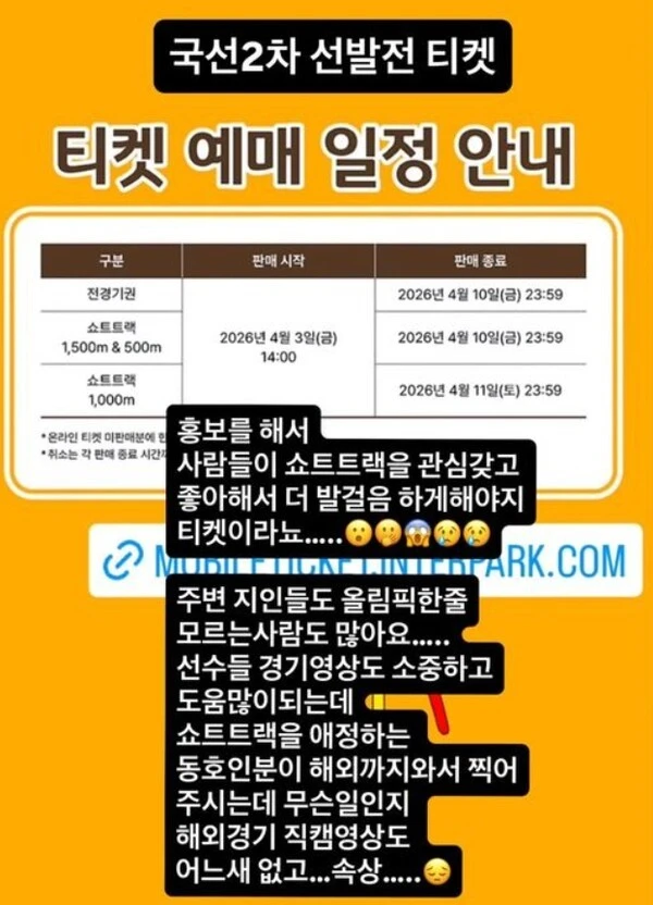 그는 자신의 인스타그램을 통해 "홍보를 해서 사람들이 쇼트트랙을 관심갖고 좋아해서 더 발걸음하게 해야지 티켓이라뇨"라며 아쉬움을 드러냈다.