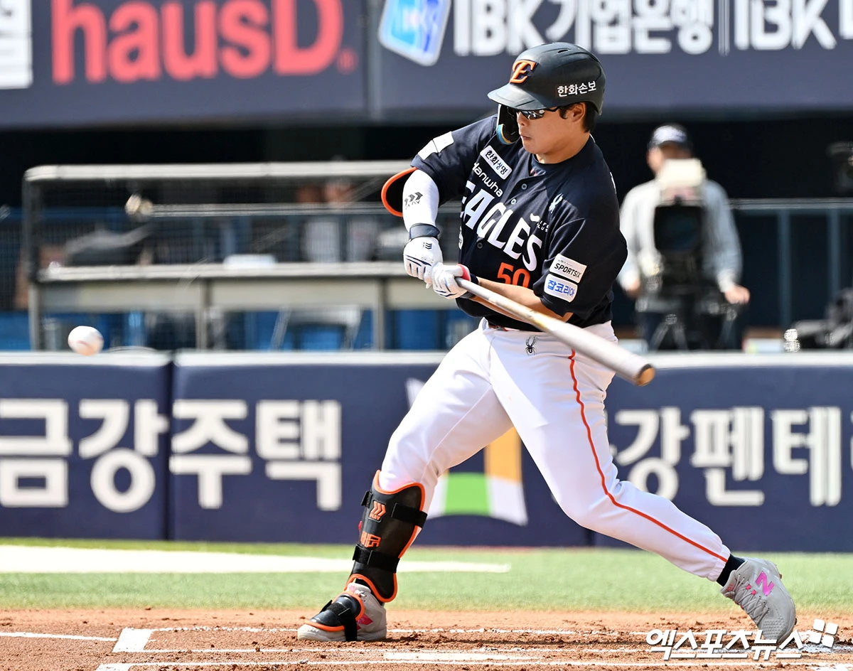 (엑스포츠뉴스 잠실, 김한준 기자) 4일 오후 서울 송파구 잠실야구장에서 열린 '2026 신한 SOL Bank KBO리그' 한화 이글스와 두산 베어스의 경기, 1회초 1사 3루 한화 강백호가 1타점 적시타를 날리고 있다.
