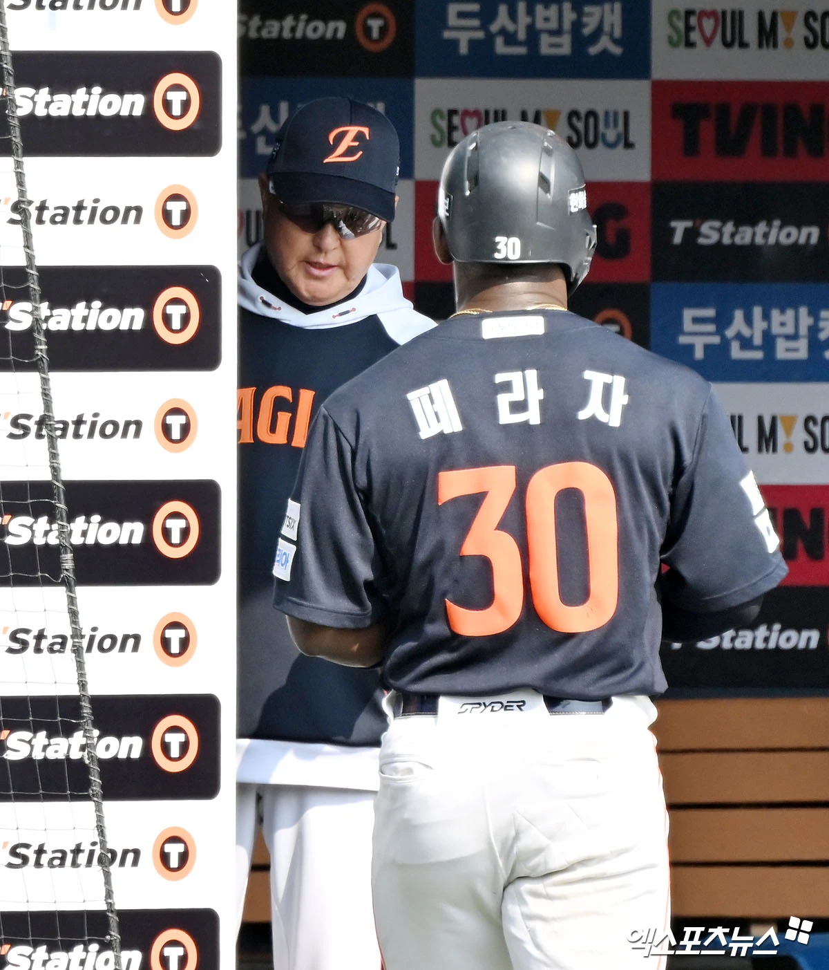 (엑스포츠뉴스 잠실, 김한준 기자) 4일 오후 서울 송파구 잠실야구장에서 열린 '2026 신한 SOL Bank KBO리그' 한화 이글스와 두산 베어스의 경기, 5회초 1사 만루 한화 페라자가 채은성의 1타점 희생타때 득점에 성공하고 있다.