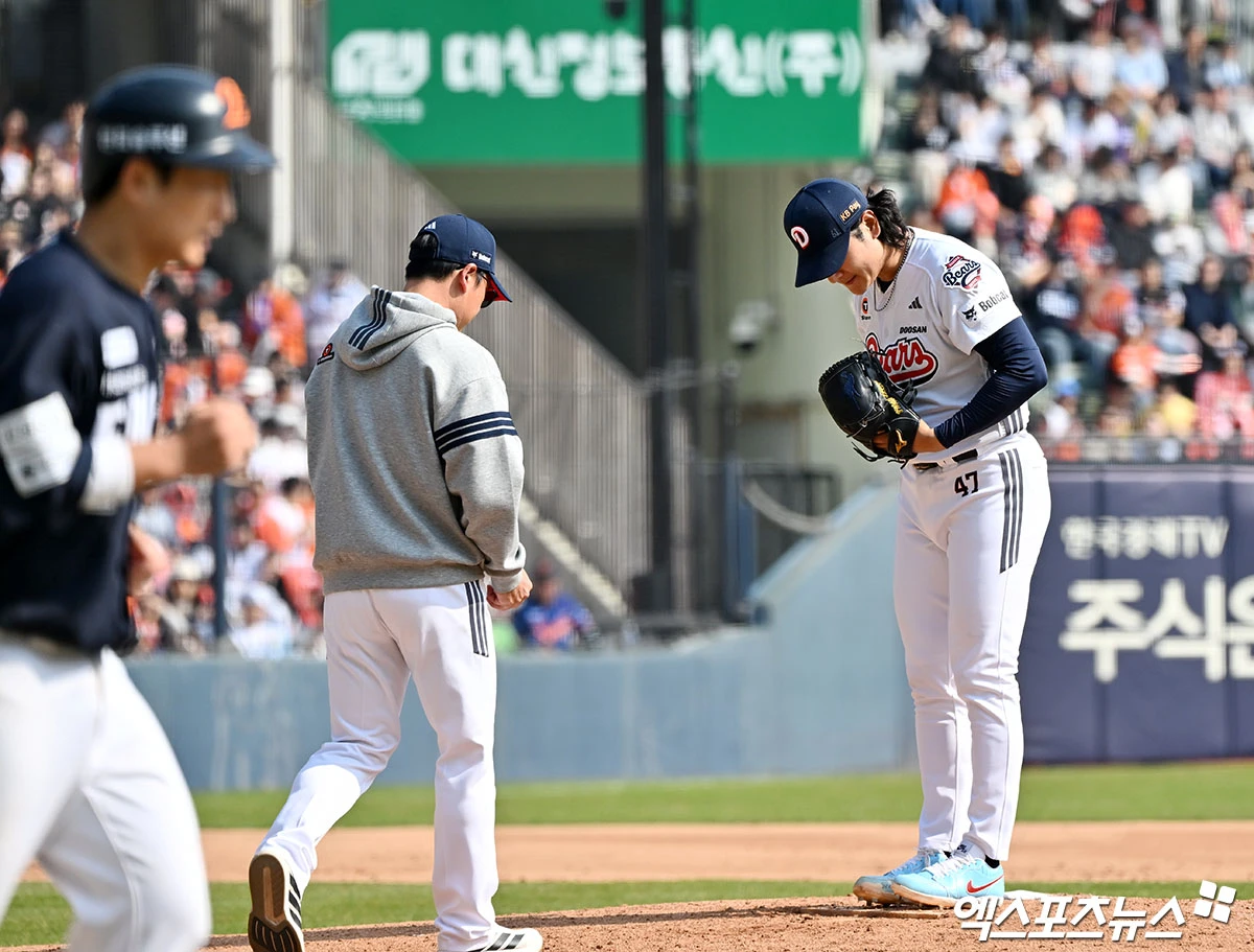 (엑스포츠뉴스 잠실, 김한준 기자) 4일 오후 서울 송파구 잠실야구장에서 열린 '2026 신한 SOL Bank KBO리그' 한화 이글스와 두산 베어스의 경기, 5회초 2사 만루 두산 곽빈이 마운드를 내려오고 있다.