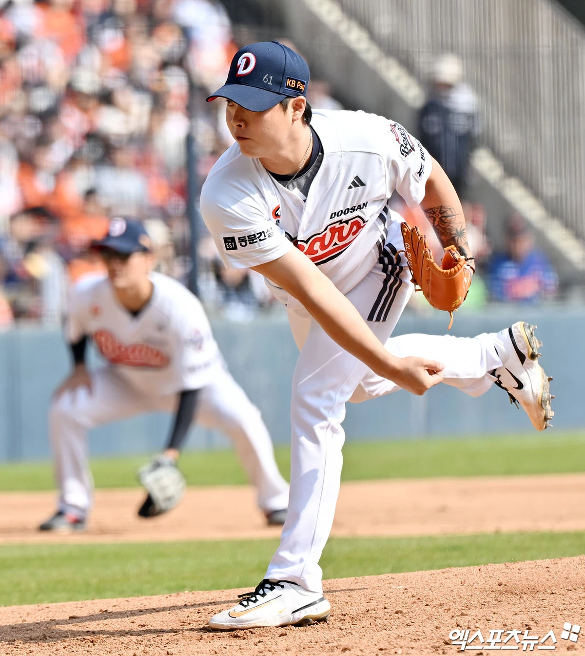 (엑스포츠뉴스 잠실, 김한준 기자) 4일 오후 서울 송파구 잠실야구장에서 열린 '2026 신한 SOL Bank KBO리그' 한화 이글스와 두산 베어스의 경기, 5회초 2사 만루 두산 박치국이 공을 힘차게 던지고 있다.
