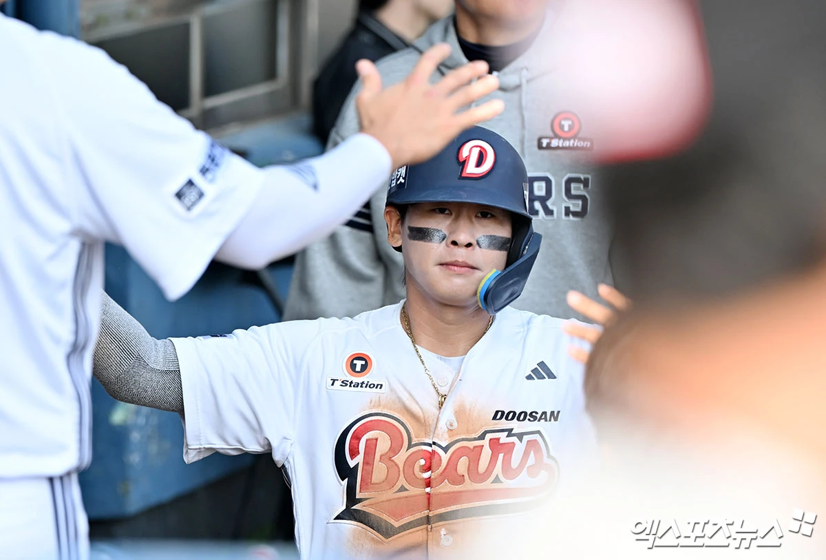 (엑스포츠뉴스 잠실, 김한준 기자) 4일 오후 서울 송파구 잠실야구장에서 열린 '2026 신한 SOL Bank KBO리그' 한화 이글스와 두산 베어스의 경기, 5회말 2사 1,2루 두산 박찬호가 윤준호의 1타점 적시타때 득점에 성공하고 있다.