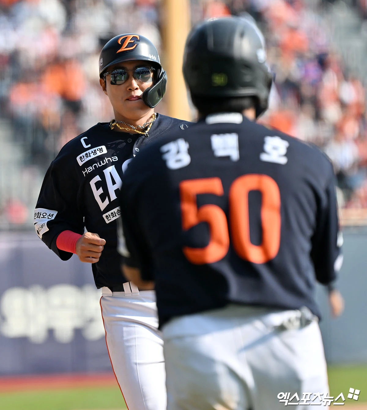 (엑스포츠뉴스 잠실, 김한준 기자) 4일 오후 서울 송파구 잠실야구장에서 열린 '2026 신한 SOL Bank KBO리그' 한화 이글스와 두산 베어스의 경기, 6회초 2사 2,3루 한화 채은성이 하주석의 2타점 2루타때 득점에 성공하고 있다.