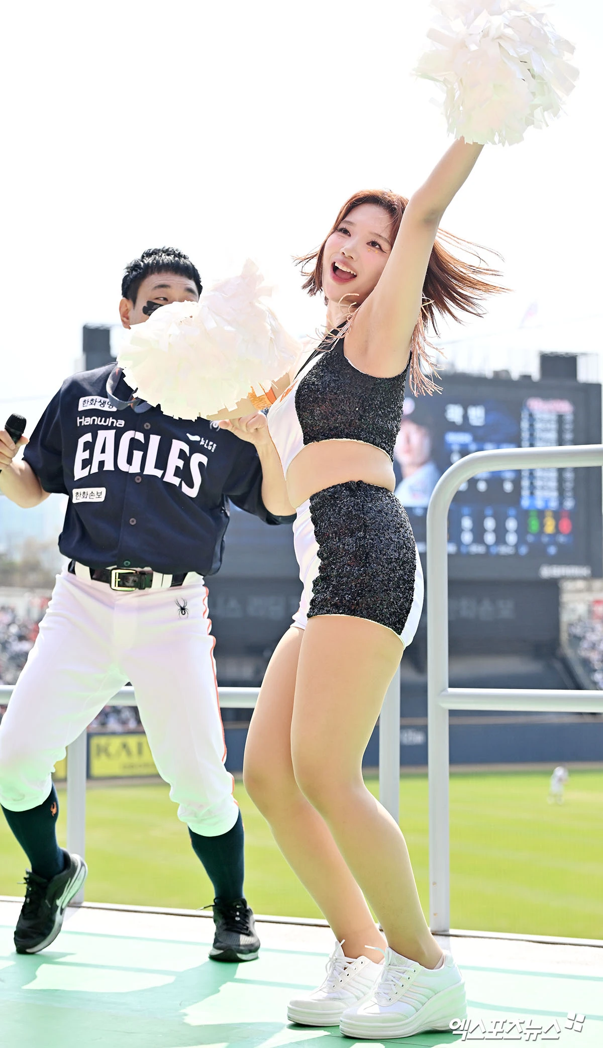 (엑스포츠뉴스 잠실, 김한준 기자) 4일 오후 서울 송파구 잠실야구장에서 열린 '2026 신한 SOL Bank KBO리그' 한화 이글스와 두산 베어스의 경기, 김이현 치어리더가 열띤 응원을 선보이고 있다.