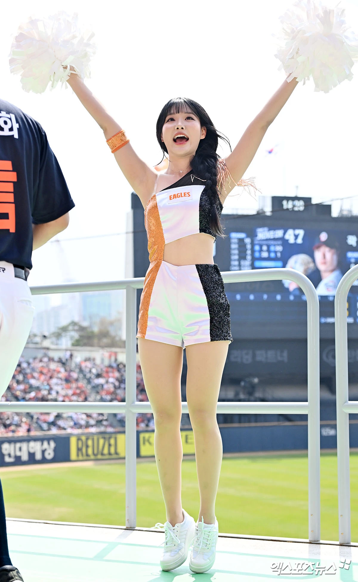 (엑스포츠뉴스 잠실, 김한준 기자) 4일 오후 서울 송파구 잠실야구장에서 열린 '2026 신한 SOL Bank KBO리그' 한화 이글스와 두산 베어스의 경기, 최홍라 치어리더가 열띤 응원을 선보이고 있다.