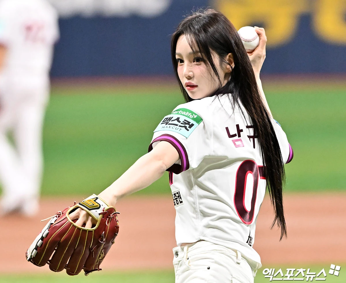 (엑스포츠뉴스 고척, 김한준 기자) 5일 오후 서울 구로구 고척스카이돔에서 열린 '2026 신한 SOL Bank KBO리그' LG 트윈스와 키움 히어로즈의 경기, 경기 전 씨야 남규리가 시구에 임하고 있다.
