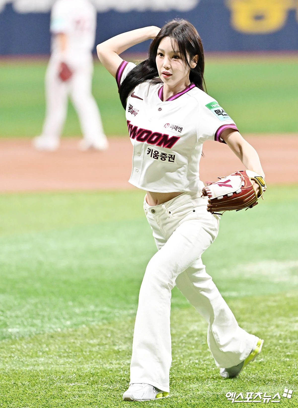 (엑스포츠뉴스 고척, 김한준 기자) 5일 오후 서울 구로구 고척스카이돔에서 열린 '2026 신한 SOL Bank KBO리그' LG 트윈스와 키움 히어로즈의 경기, 경기 전 씨야 남규리가 시구에 임하고 있다.