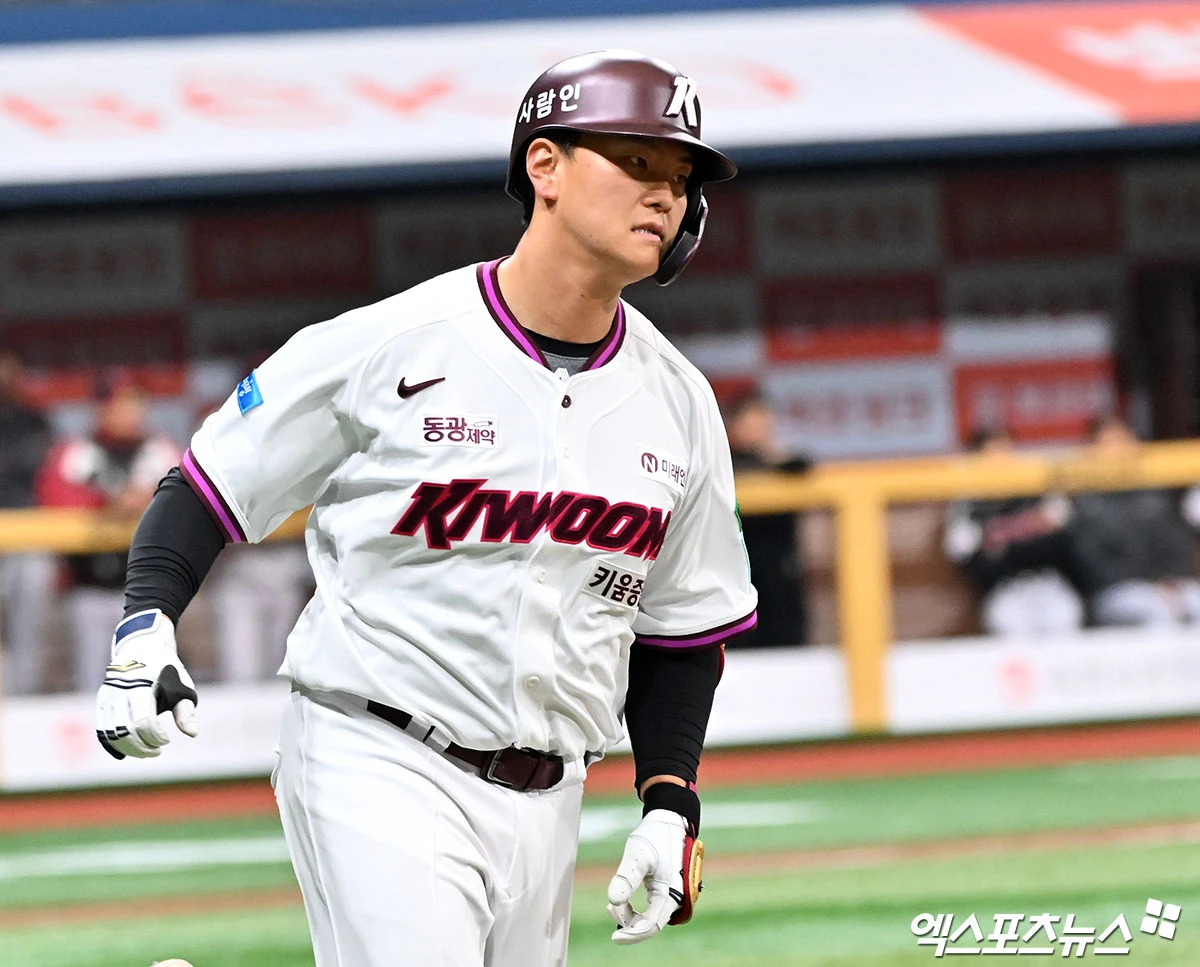 (엑스포츠뉴스 고척, 김한준 기자) 5일 오후 서울 구로구 고척스카이돔에서 열린 '2026 신한 SOL Bank KBO리그' LG 트윈스와 키움 히어로즈의 경기, 2회말 1사 키움 김건희가 솔로 홈런을 날린 후 기뻐하고 있다.