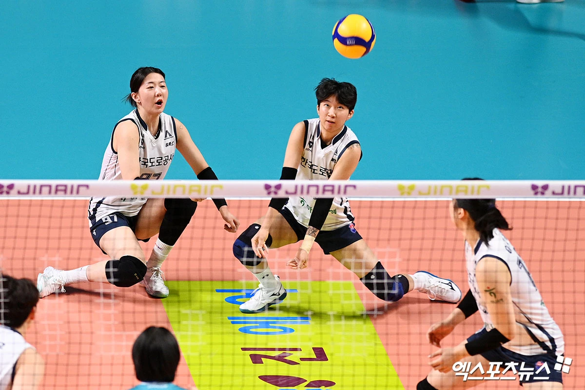 (엑스포츠뉴스 장충, 고아라 기자) 5일 오후 서울 장충체육관에서 열린 '진에어 2025-2026 V-리그' 포스트시즌 여자부 챔피언결정전 GS칼텍스와 한국도로공사 경기, 한국도로공사 강소휘, 김세인이 리시브를 시도하고 있다.