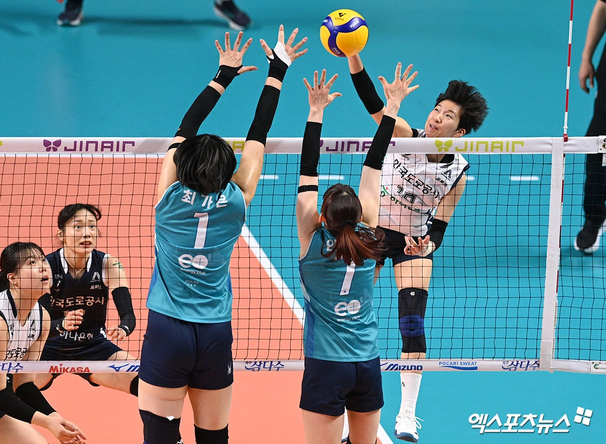 (엑스포츠뉴스 장충, 고아라 기자) 5일 오후 서울 장충체육관에서 열린 '진에어 2025-2026 V-리그' 포스트시즌 여자부 챔피언결정전 GS칼텍스와 한국도로공사 경기, 한국도로공사 김세인이 공격을 시도하고 있다.