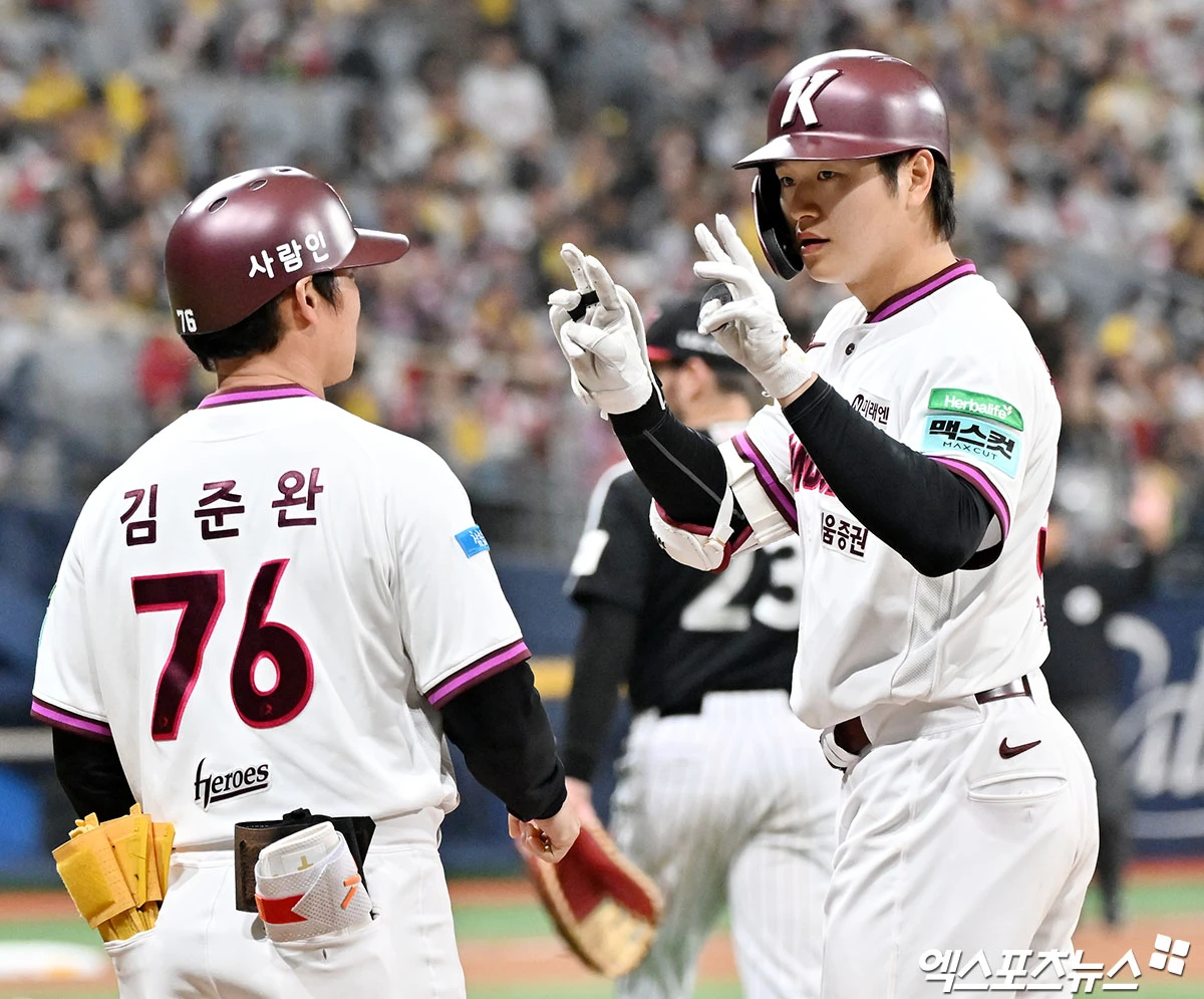 (엑스포츠뉴스 고척, 김한준 기자) 5일 오후 서울 구로구 고척스카이돔에서 열린 '2026 신한 SOL Bank KBO리그' LG 트윈스와 키움 히어로즈의 경기, 7회말 키움 박주홍이 좌전안타를 날리고 있다.
