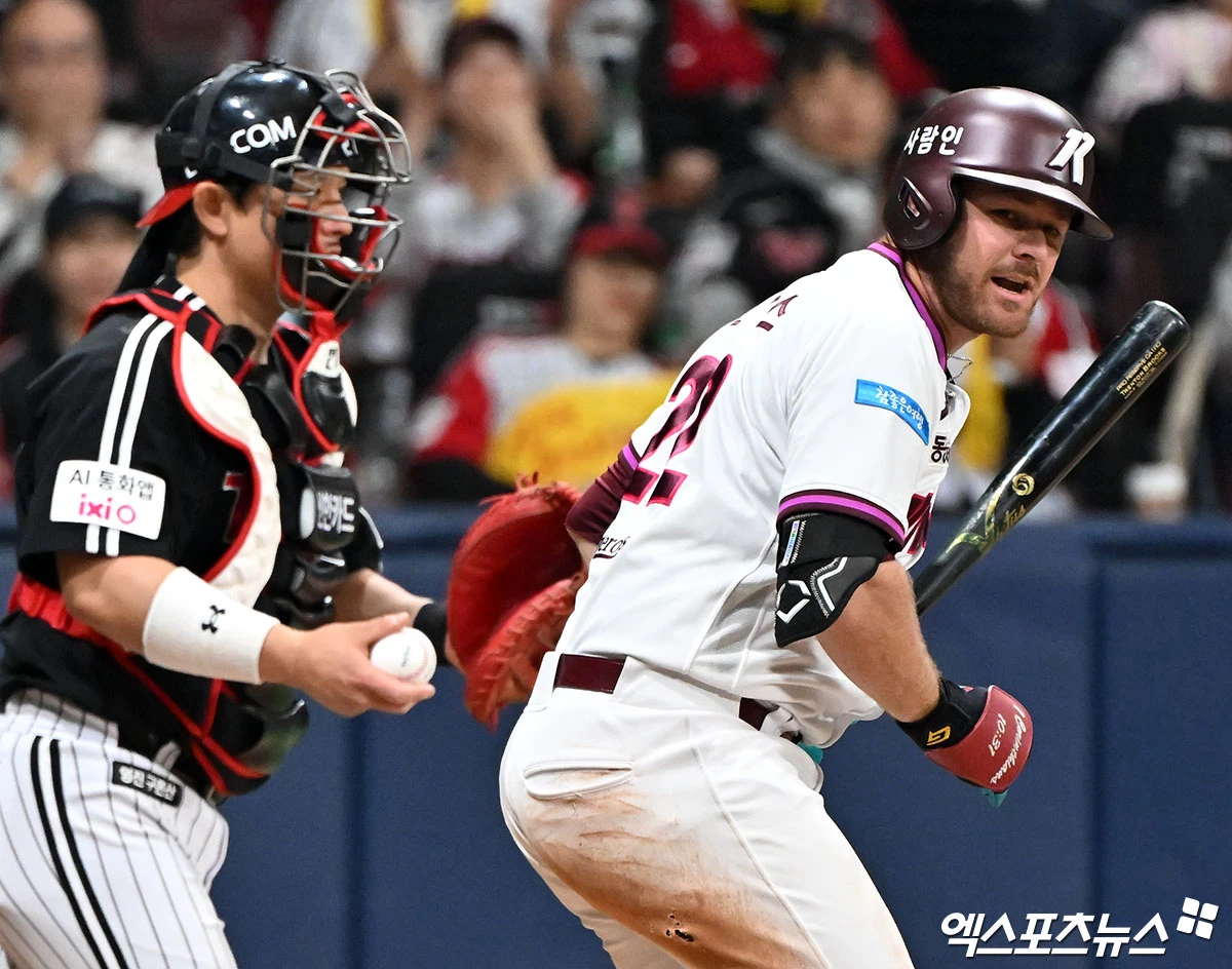 (엑스포츠뉴스 고척, 김한준 기자) 5일 오후 서울 구로구 고척스카이돔에서 열린 '2026 신한 SOL Bank KBO리그' LG 트윈스와 키움 히어로즈의 경기, 7회말 1사 1,2루 키움 브룩스가 루킹 삼진을 당한 후 아쉬워하고 있다.