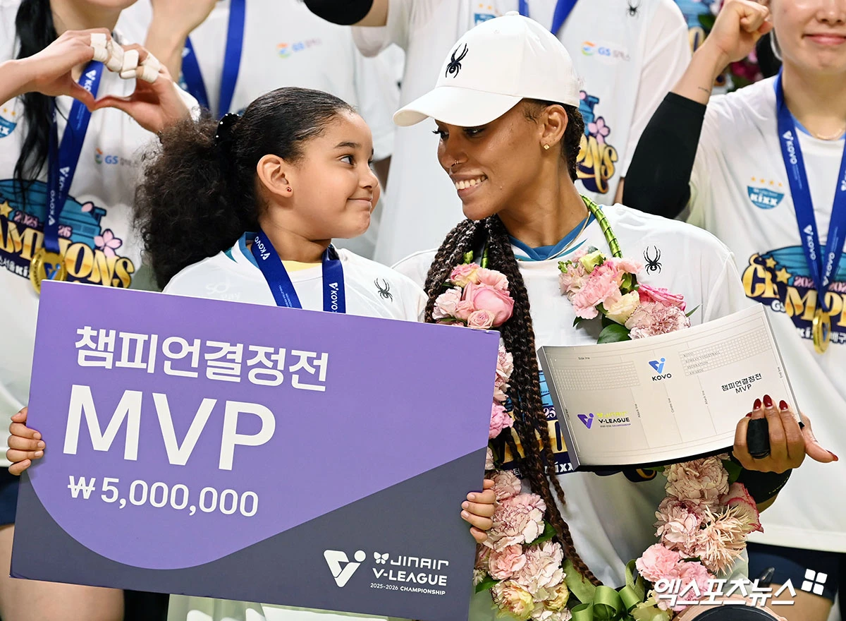 (엑스포츠뉴스 장충, 고아라 기자) 5일 오후 서울 장충체육관에서 열린 '진에어 2025-2026 V-리그' 포스트시즌 여자부 챔피언결정전 GS칼텍스와 한국도로공사 경기, 우승을 차지한 GS칼텍스 실바가 MVP로 선정돼 기념촬영을 하고 있다.