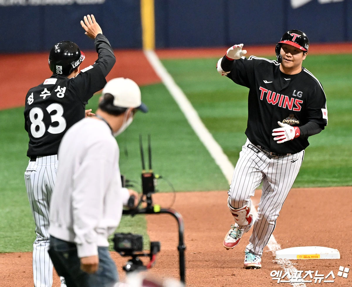 (엑스포츠뉴스 고척, 김한준 기자) 5일 오후 서울 구로구 고척스카이돔에서 열린 '2026 신한 SOL Bank KBO리그' LG 트윈스와 키움 히어로즈의 경기, 9회초 LG 문보경이 솔로 홈런을 날린 후 기뻐하고 있다.