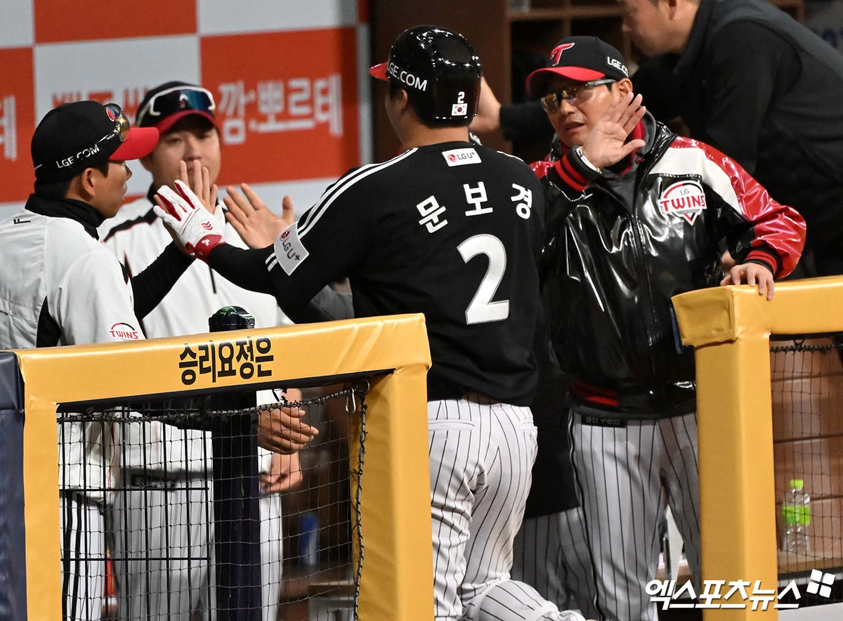 염경엽 감독 ‘문보경 홈런에 환호’[포토]