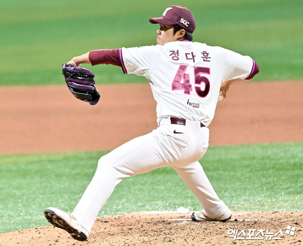 (엑스포츠뉴스 고척, 김한준 기자) 5일 오후 서울 구로구 고척스카이돔에서 열린 '2026 신한 SOL Bank KBO리그' LG 트윈스와 키움 히어로즈의 경기, 9회초 키움 정다훈이 공을 힘차게 던지고 있다.