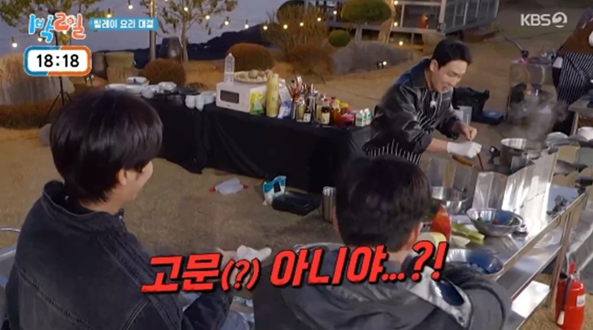 이준은 손등에 소스를 묻혀서 맛을 보라는 지시가 내려지자 소스를 묻혀봤다가 뜨겁다고 당황한 모습을 보였다.