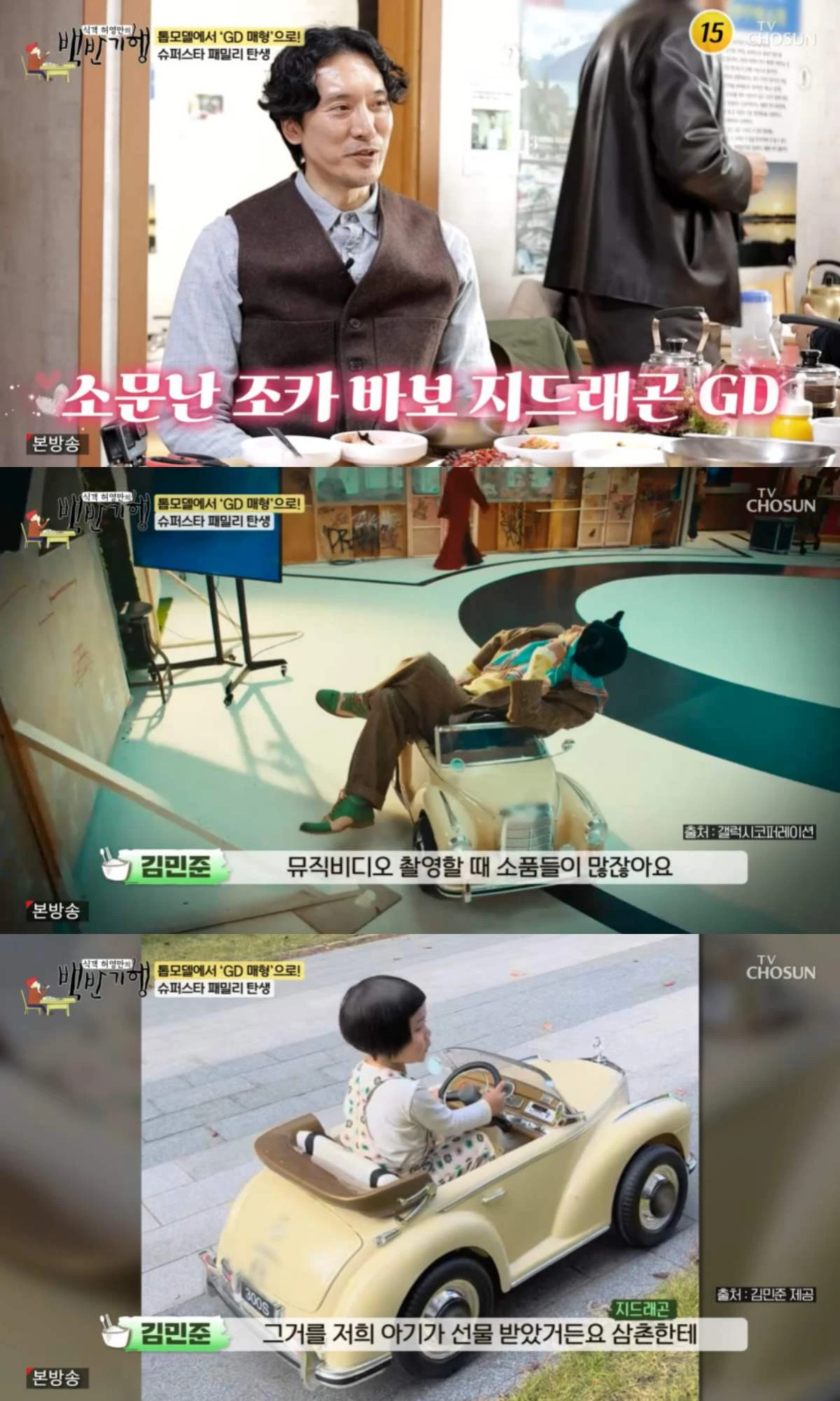 김민준은 "뮤직비디오에 소품이 많지 않나.그걸 삼촌에게 저희 애기가 선물 받았다"며 화제가 된 지드래곤의 '외제차 선물' 일화를 꺼냈다.