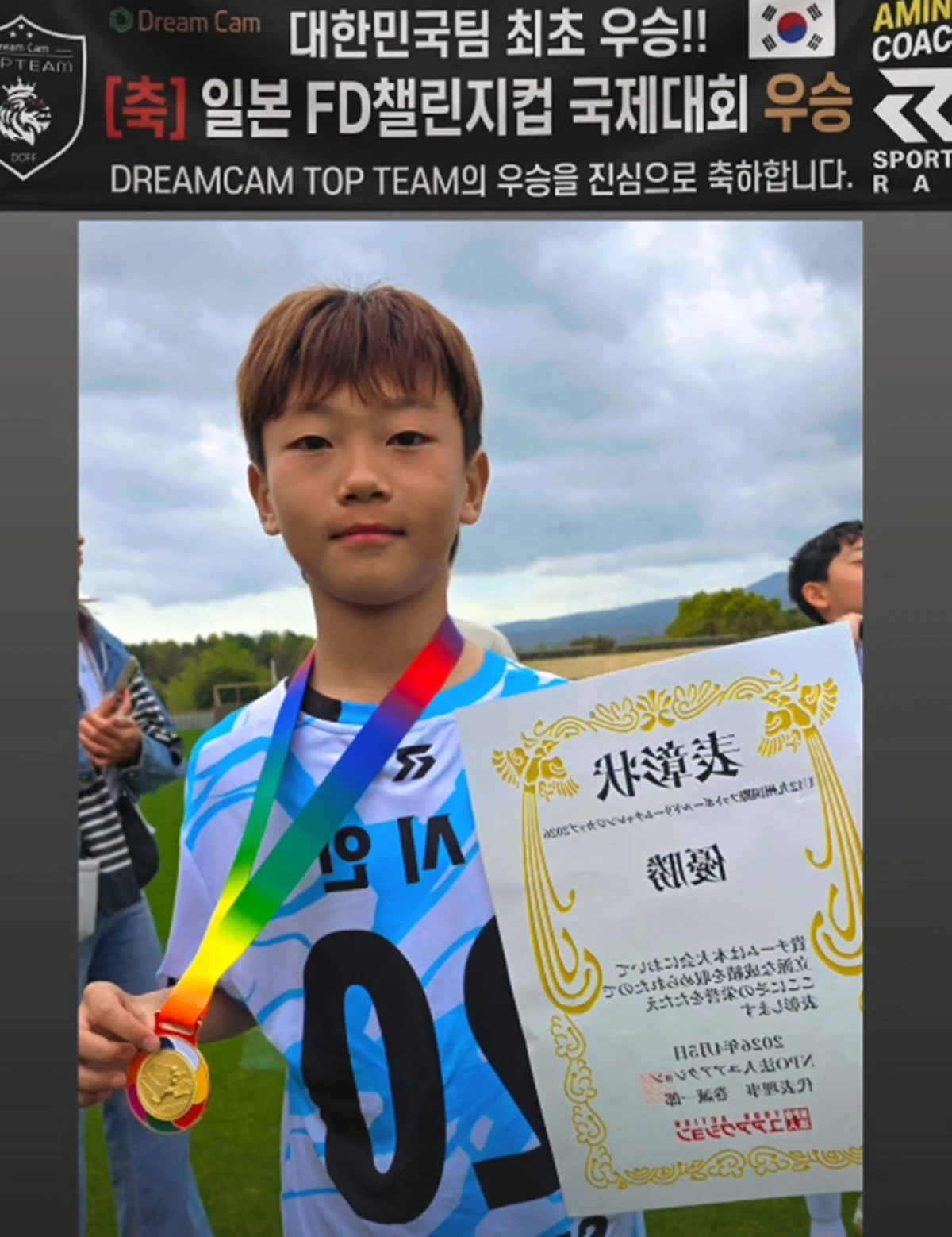 특히 "일본 유소년 국제 대회 FD챌린지컵 우승", "대한민국팀 최초 우승! 일본 FD챌린지컵 국제대회 우승", "DREAMCAM TOP TEAM의 우승을 진심으로 축하합니다"라는 문구가 눈길을 끌었다.