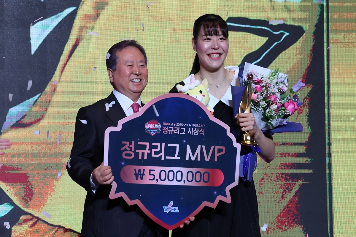 박지수는 6일 서울 용산구 드래곤시티 호텔에서 열린 BNK금융 2025-2026 여자프로농구 정규리그 시상식에서 기자단 총 119표 중 53표를 얻어 동료 허예은(31표), 강이슬(24표)을 제치고 최우수선수(MVP)를 차지했다.