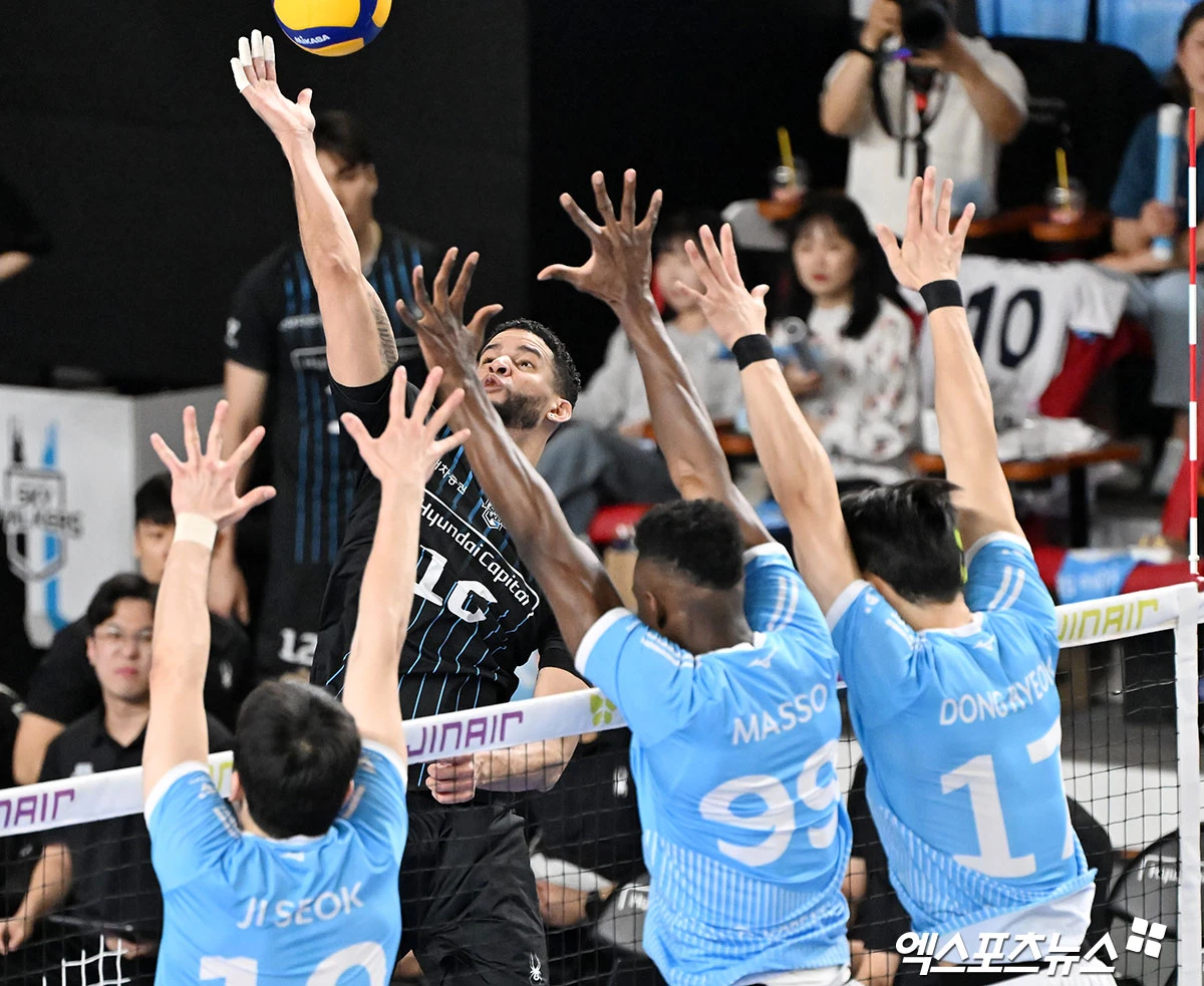 (엑스포츠뉴스 천안, 김한준 기자) 6일 오후 충남 천안유관순체육관에서 열린 '진에어 2025-2026 V-리그' 현대캐피탈과 대한항공의 챔피언결정전 3차전 경기, 현대캐피탈 레오가 공격을 시도하고 있다.
