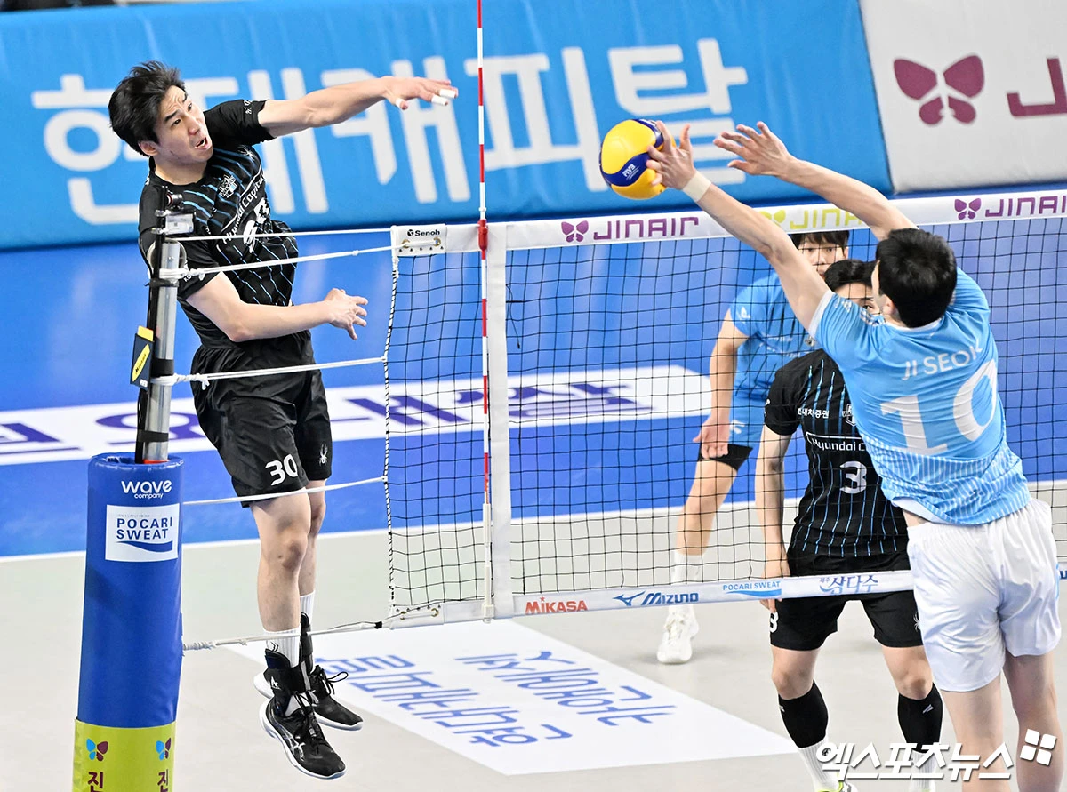 (엑스포츠뉴스 천안, 김한준 기자) 6일 오후 충남 천안유관순체육관에서 열린 '진에어 2025-2026 V-리그' 현대캐피탈과 대한항공의 챔피언결정전 3차전 경기, 현대캐피탈 신호진이 공격을 시도하고 있다.