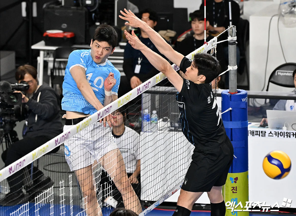 (엑스포츠뉴스 천안, 김한준 기자) 6일 오후 충남 천안유관순체육관에서 열린 '진에어 2025-2026 V-리그' 현대캐피탈과 대한항공의 챔피언결정전 3차전 경기, 대한항공 정지석이 공격을 시도하고 있다.