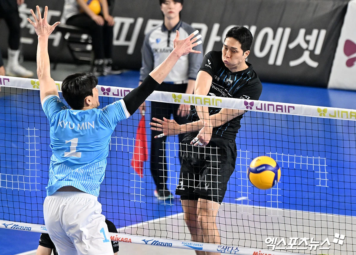 (엑스포츠뉴스 천안, 김한준 기자) 6일 오후 충남 천안유관순체육관에서 열린 '진에어 2025-2026 V-리그' 현대캐피탈과 대한항공의 챔피언결정전 3차전 경기, 현대캐피탈 최민호가 공격을 시도하고 있다.