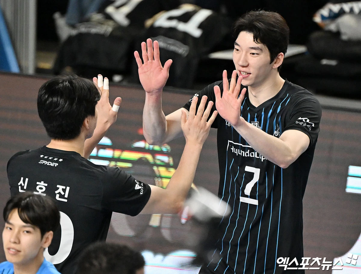 (엑스포츠뉴스 천안, 김한준 기자) 6일 오후 충남 천안유관순체육관에서 열린 '진에어 2025-2026 V-리그' 현대캐피탈과 대한항공의 챔피언결정전 3차전 경기, 현대캐피탈 허수봉이 기뻐하고 있다.