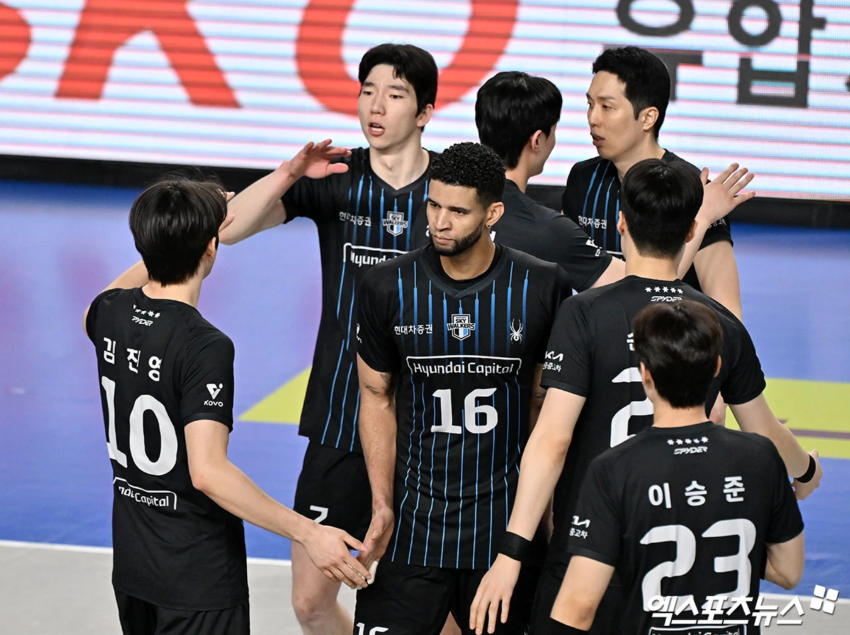 이날 경기에서 승리한 현대캐피탈 선수들이 기뻐하고 있다.