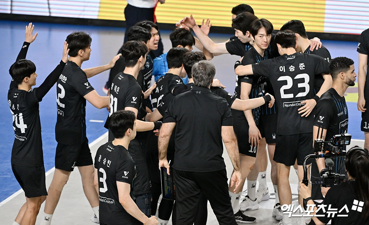 이날 경기에서 승리한 현대캐피탈 선수들이 기뻐하고 있다.